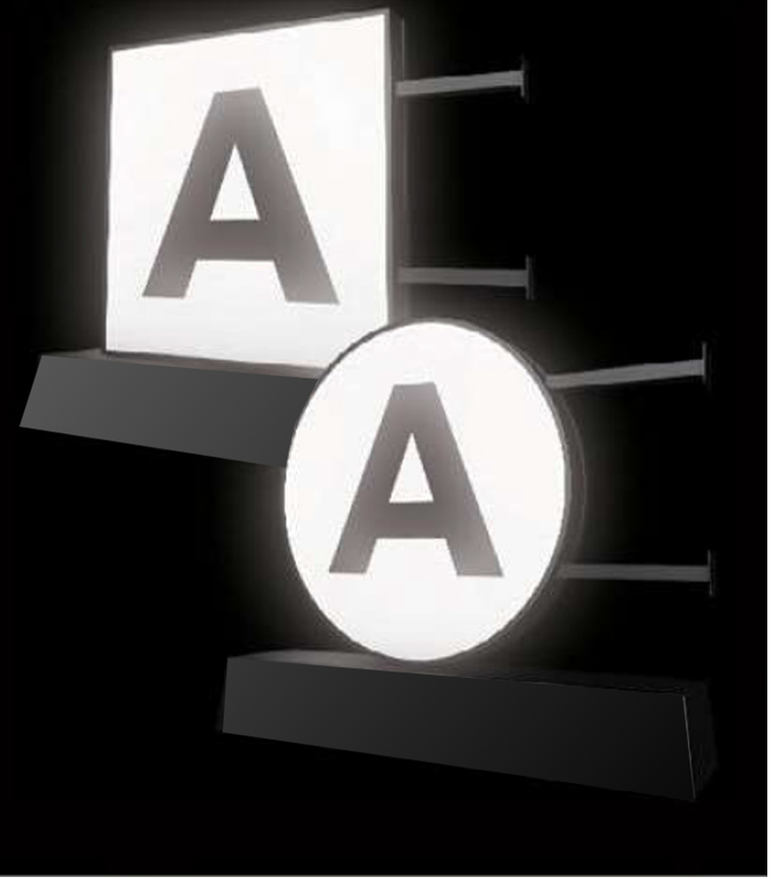 An LED lit lightbox which has a logo on each side of it and can be mounted horizontally off of a building.