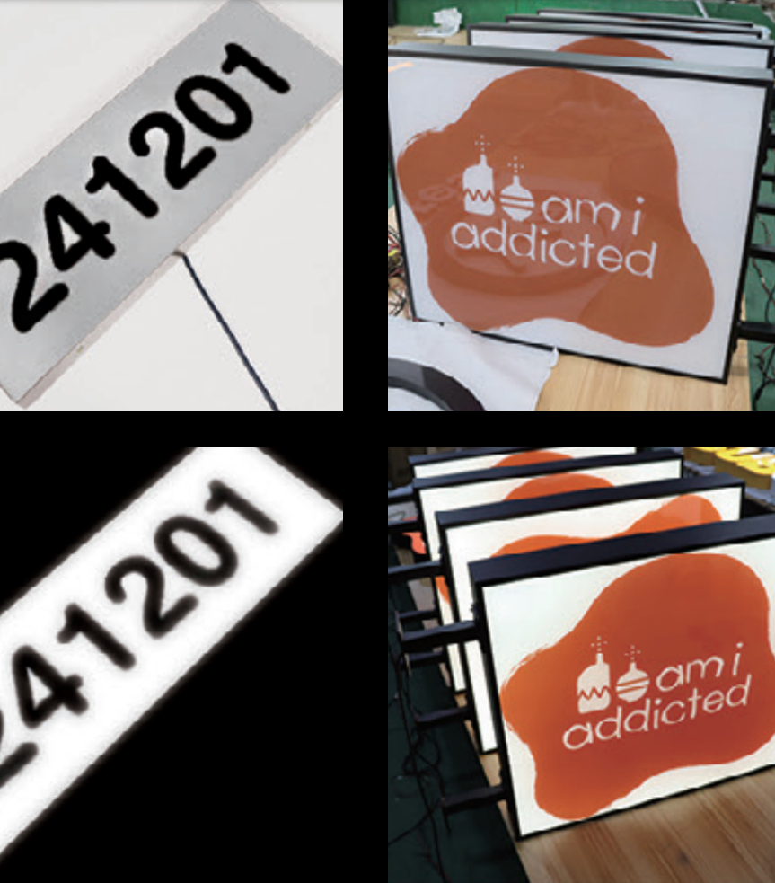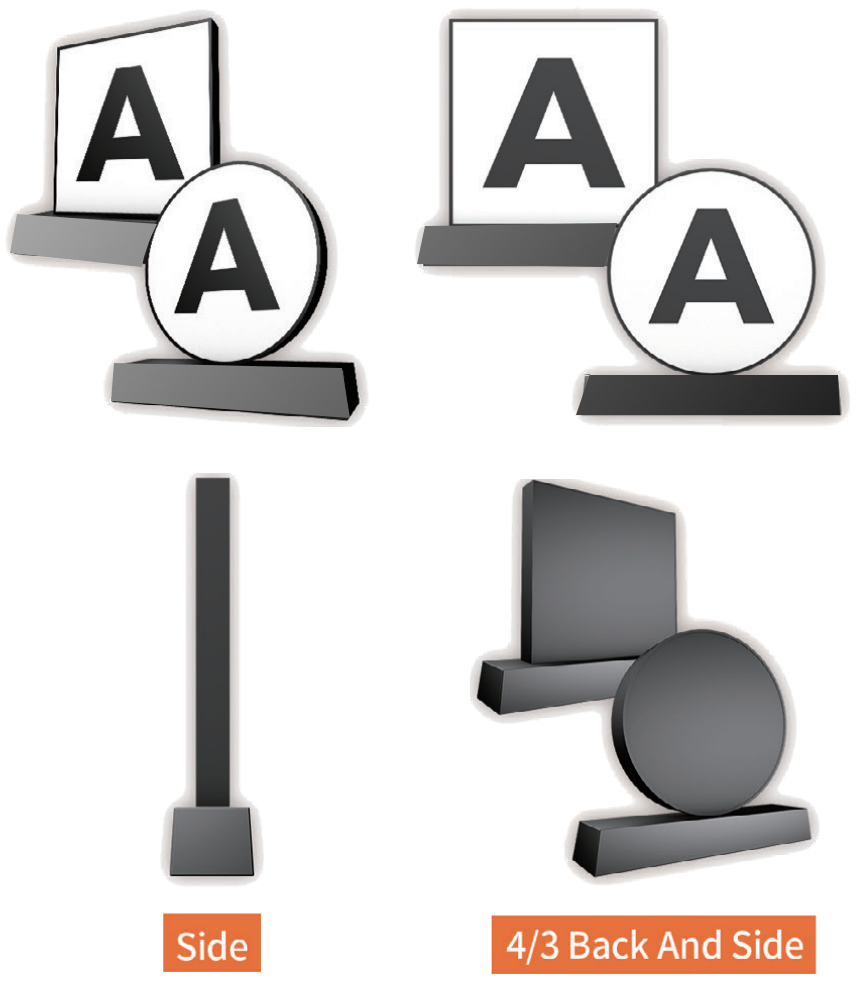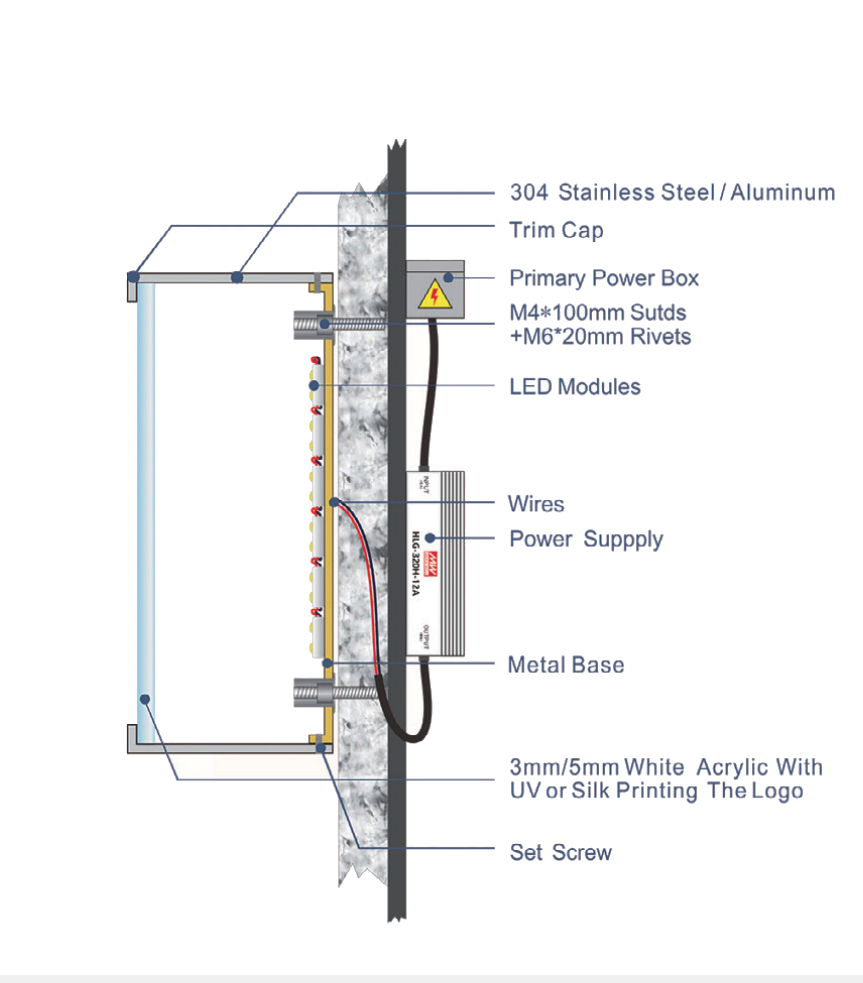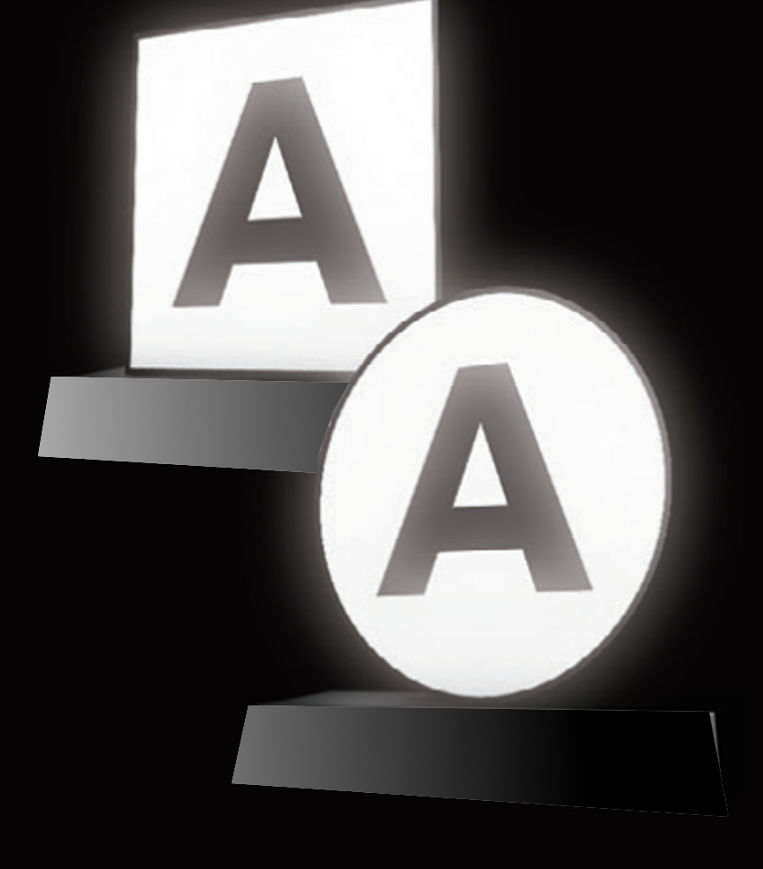An LED lit square or circular box with a logo/text appearing on an acrylic front (front lights up, sides and back do not) |